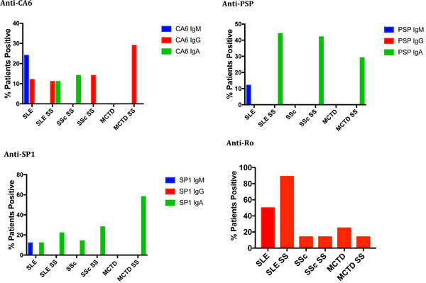 Fig. (2). Expression of anti-Ro, anti-CA6, anti-PSP and anti-SPI antibodies were evaluated in 8 patients with SLE and no SS, 9 patients with SLE and secondary SS, 7 patients with SSc and no SS, 7 patients with SSc and secondary SS, 4 patients with MCTD and no SS and 7 patients with MCTD and secondary SS. Data shown are the percentage of patients in each of these groups expressing either IgM, IgG or IgA antibodies to CA6, PSP or SP1 or IgG antibodies to Ro.