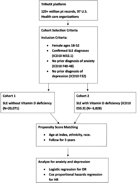 The primary outcomes of interest were the development of anxiety-related disorders and depressive episodes following the diagnosis of SLE. To evaluate the association between vitamin D deficiency and these outcomes, logistic regression models were used to calculate odds ratios (OR) with 95% confidence intervals.